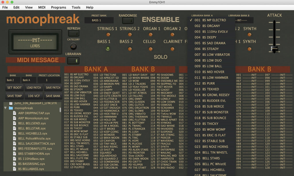 With the right firmware mod (that’s right – no mysterious hacky soldered in dials) for old board Roland EM-101 machines, the EM-101 is no longer a preset machine. Often billed as a cutdown Juno 106 restricted to just 24 presets, this box previously had some interesting uses but didn’t really deliver as an anlogue beast in my arsenal. It was too restricted. Until now. Due to the amazing work by Ryan (Plutoniq), the EM-101 has been give a new lease of life and transformed into a strong addition to my music making and since the parameters can now be controlled over midi CC, I have written an editor to load in presets from the Juno 106 and MKS-7, extended to a new Roland EM-101 format with naming and created a preset saving system and librarian for patch recall. It’s not a Juno 106 but it is a very nice sounding a machine with it’s own character sharing a lot of parallels. If I have understood correctly (there could be inaccuracies!), it has a M5232RS tone generator chip with 36 (I think) waveforms that are beautifully shaped by Roland analogue fitters. A good example is the IR3109 VCF filter, found in a the Jupiter 8 or M5241L VCA found in the MKS-70. If you look at the chip list, there are lots of shared electronics that overlap between Junos, Juipter and other quality Roland gear of it’s time, giving it character. Notably, the MN3009 and MN3101 chorus chips shared by the Juno 106 chorus. It has interesting analogue effects on board but the chorus particularly shines due to the much greater CC control (as you can see from the screenshot). That chorus is gorgous, adds that analogue sheen and processing. I spent last night building up a preset bank for the EM-101 to release with the editor (and check bank functionality) and got lost inside this little beauty.
